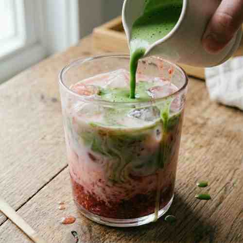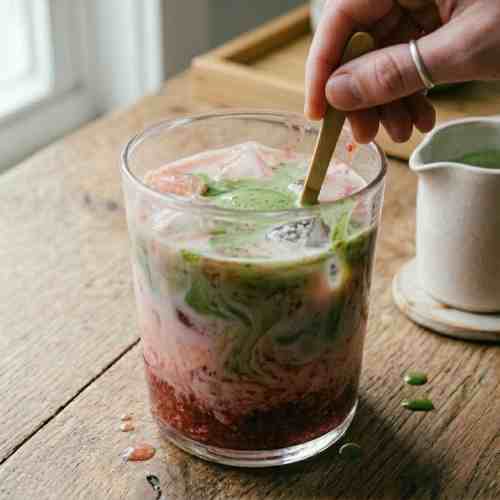 Strawberry matcha is a soft, creamy drink with a mix of sweet and earthy flavors. The fresh strawberries add a bright taste, while the matcha gives a smooth and calm feel. The layers of red, white, and green also make this drink look very pretty.