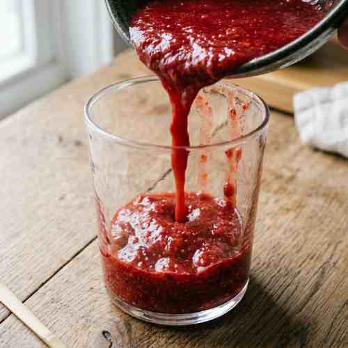 - Pour the strawberry mixture into a glass and spread slightly along the sides.