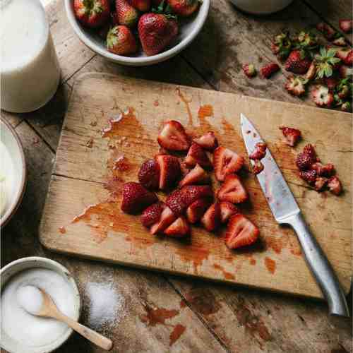 - Wash strawberries and remove the green tops. Chop into small pieces.