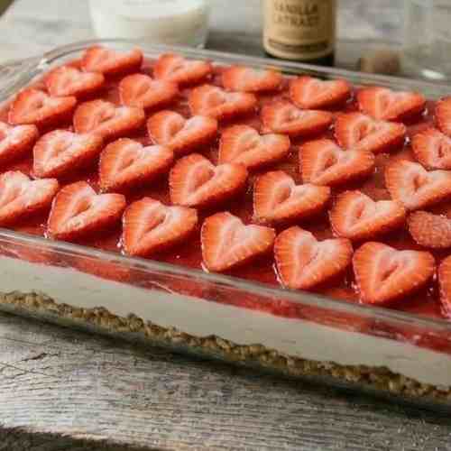 With a simple pretzel crust, creamy filling, and juicy strawberries on top, this dessert is not just delicious but also looks beautiful on the table.