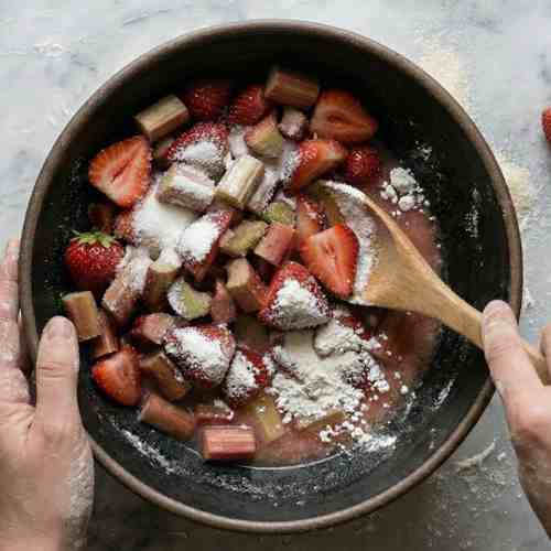 - In a large bowl, combine chopped strawberries and rhubarb. Add sugar, brown sugar, and corn starch. Mix until the fruit is well coated and the mixture begins to look slightly thick.