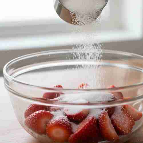 - While the biscuits bake, slice the strawberries and mix with sugar. Let them sit for about 15 minutes to release their juices.