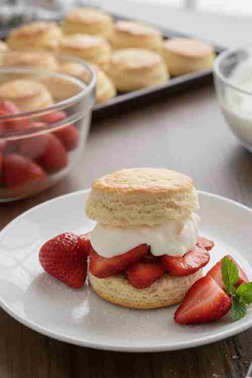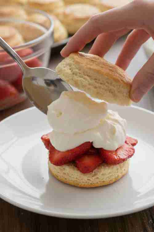 - Slice the warm biscuits in half, layer with strawberries, and top with whipped cream. Add the other half of the biscuit and finish with more strawberries and whipped cream.
