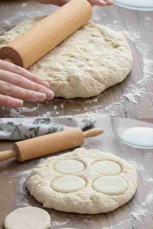 Flour your counter or a cutting board, then gently pat the dough out to about 1-inch thick. You can use a rolling pin, or just use the hands. Cut the dough into circles using a biscuit cutter, or if you don’t have one, use a glass. I always find the kids’ drinking glasses work just fine.