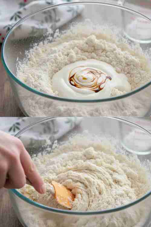 - Pour in the heavy cream and vanilla extract, stirring gently until a dough forms. Don’t overmix!