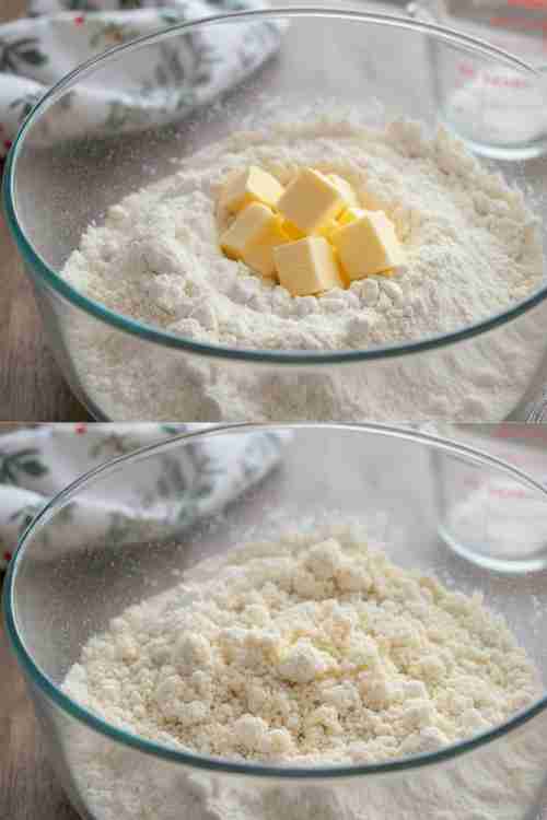 - Add the cold butter and use a pastry cutter or two forks to mix it into the dry ingredients until it resembles small crumbs.
