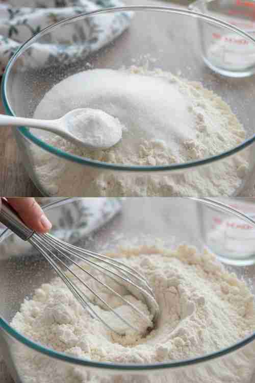 In a large bowl, combine your flour, sugar, baking powder, and salt. Whisk it all together to make sure it’s well mixed. It’s like getting the dry stuff out of the way so you can focus on the good parts later.