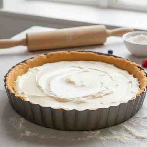 Once your tart crust has cooled down, it’s time to fill it up! Spoon that creamy goodness into your crust and spread it out evenly. You can use a spatula to make it smooth, or you can get fancy and make little swirls (no one’s judging you).