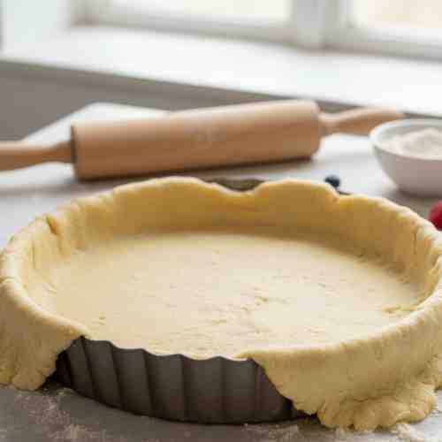 Once the dough is ready, roll it out on a floured surface, making it big enough to fit into your tart pan (mine’s 9 inches). Press the dough into the pan, making sure to get it into the edges. Then, take a fork and poke the bottom a few times. This helps it bake without puffing up.