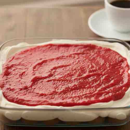 Once the first layer of ladyfingers is down, spread half of your mascarpone mixture over the top. Don’t worry about being perfect; you just want a nice, even layer. Then, drizzle some of your strawberry puree over that. The mix of creamy mascarpone and sweet strawberry is what dreams are made of. Repeat with another layer of dipped ladyfingers, followed by the rest of the mascarpone mixture and the rest of the strawberry puree.