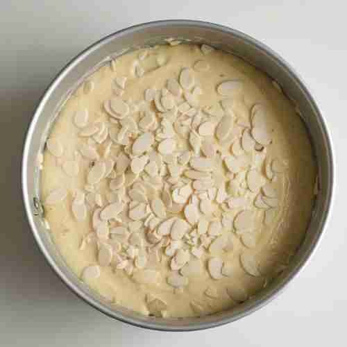 - Pour batter into prepared pan and smooth the top. Sprinkle sliced almonds evenly over the top.