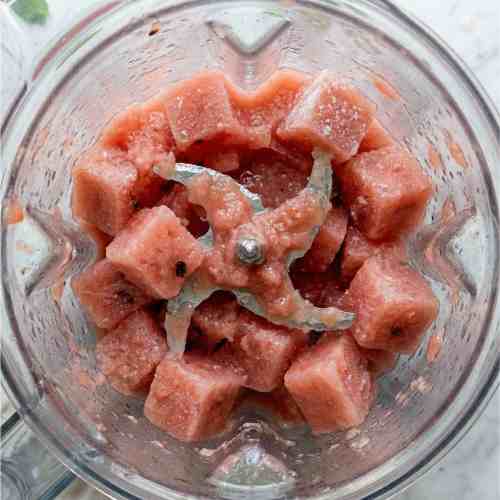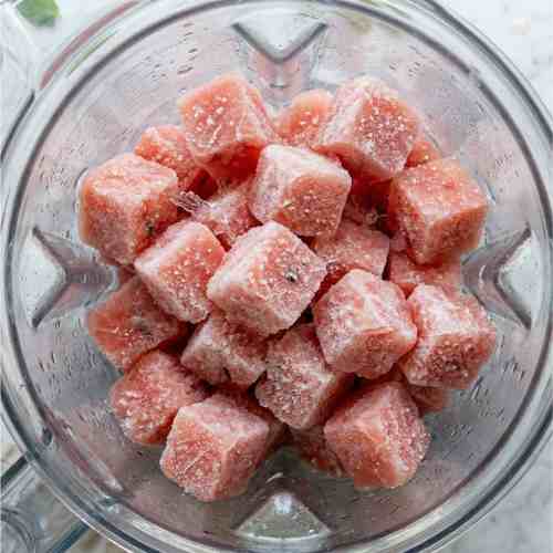 Take the frozen watermelon cubes out of the freezer and let them sit for 2 to 3 minutes so they are slightly easier to blend.