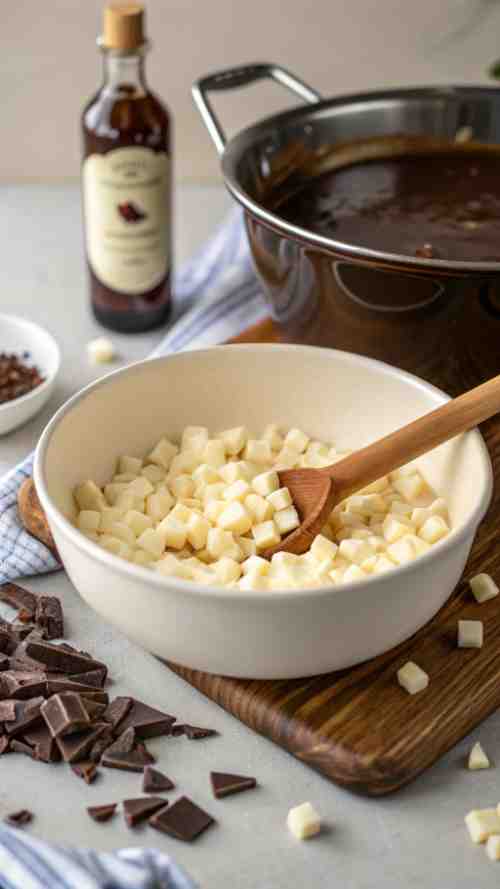 - Pour over the chopped white chocolate and let sit for 1 minute.